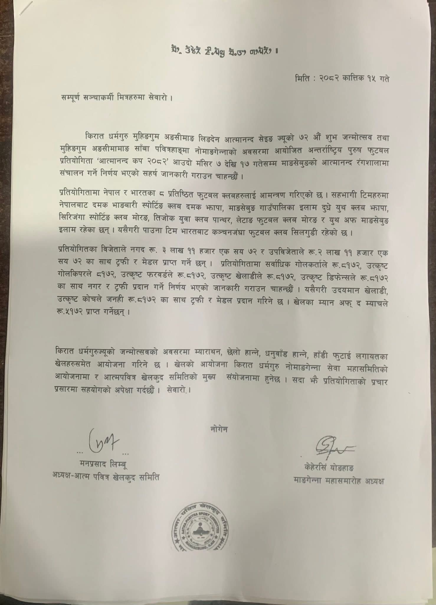 माङसेबुङ/किरात धर्मगुरु मुहिङगुम अङसीमाङ लिङदेन आत्मानन्द सेइङज्यूको ७२औं शुभजन्मोत्सव तथा मुहिङगुम अङसीमामाङ साँबा पवित्रहाङमा लिङ्देनज्यूको नुमाङगेन्ना सेवाको अवसरमा आयोजित अन्तर्राष्ट्रिय पुरुष फुटबल प्रतियोगिता ‘आत्मानन्द गोल्ड कप २०८२’ आउदो मंसिर ७ गतेबाट १७ गतेसम्म माङसेबुङको आत्मानन्द रंगशालामा सञ्चालन हुने भएको छ ।
